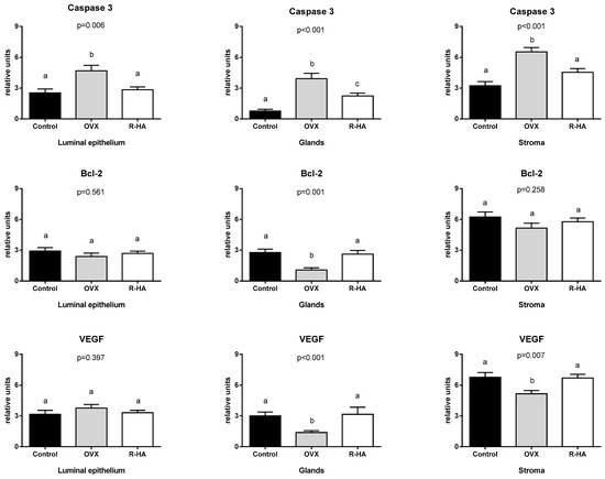 Ovariectomy was associated with increased Casp-3 but decreased Bcl-2 expression, especially in endometrial glands cells. The antiapoptotic effect of R-HA administration was associated with increased VEGF expression.