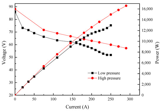 The homemade PEMFC stack was first evaluated on the Rigor fuel cell test system (RG24020) at 75 °C, with 80% relatively humidity (RH) under different backpressure. The backpressure of H2 and air (air stoichiometric ratio: 2.5) were first set at 140 kPa and 130 kPa, respectively. The polarization curve of the stack displayed a typical pattern and reached an output power of 15.8 kW. After decreasing the backpressures of H2 and air to 60 kPa and 50 kPa (air stoichiometric ratio: 1.8), respectively, there was a decrease in stack performance (Figure 1), where the current experienced a decrease from 270 A to 190 A at a stack voltage of 58.5 V, with a sharp drop in output power from 15.8 kW to 11.11 kW.