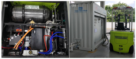 The global goal of decarbonization has prompted the exploration of hydrogen energy. Electricity can be generated through renewable energy, however, renewable energy sources are unstable and intermittent during generation which leads to electricity being difficult to apply continuously and stably [1,2]. To tackle this issue, and to greatly improve the utilization rate and stability of renewable energy, employment of hydrogen energy should be considered. The application of hydrogen energy in industrial vehicles is a very promising replacement of conventional power sources [3,4]. Forklifts have been widely applied in manufacturing and warehousing industries for the handling of materials. Existing forklifts are powered by diesel internal combustion engines, lead-acid batteries, lithium-ion batteries and fuel cells. Diesel internal engines have advantages such as high efficiency, short refueling time, strong power, etc., but this is at the expense of exhaust pollution, high working noise, vibration, and labor intensity, which are not eco-friendly or user-friendly, thus requiring research into and the development of better products. One solution to these customer demands is the development of an electric forklift that combines power sources and electric motors.