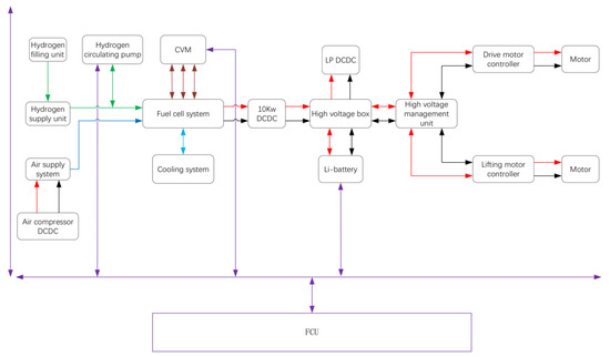 The schematic of the PEMFC power system is presented in Figure 3. The purple line represents the signal, the red and black line represent electricity, the green line represents hydrogen, the blue line represents air, and the light blue line represents the coolant. The electricity output by the PEMFC power system was allocated either to the drive motor (maximum power: 12 kW) or the lifting motor (maximum power: 14 kW). The CAN bus has been employed to communicate to each of the auxiliary parts. Data for the state of charge (SOC) of the battery, the voltage of the PEMFC stack, the hydrogen pressure, the air flow, the temperature, the FCU monitors and coordinates of the auxiliary parts that controlled the output power, and the start and stop of the PEMFC power system were collected. The main functions of the FCU included the power-on and power-off of the PEMFC power system, the work mode, the control of auxiliary parts, the fault diagnosis and processing, the torque control, etc.