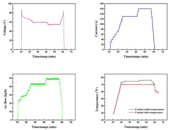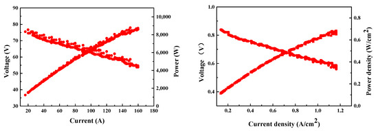Water management of the PEMFC stack was necessary to prevent flooding of the catalyst layer, while the accumulation of inert gases also required timely venting during operation. Since an improper venting cycle would lead to fierce fluctuation of the voltage, the interval of hydrogen venting (1800 A·s) was set considering both time and current. It can be seen from the chronoamperometry (Figure 6) that there were two platform areas during testing. The startup of the PEMFC stack (feeding of gas) first triggered a jump in voltage to 85 V. Afterwards, a stepwise discharge was applied to humidify the membrane as well as to activate the catalyst. After activation of the MEAs, the discharge current of the PEMFC stack was fixed at 130 A, whose corresponding voltage was stabilized at 59.6 V with a fluctuation in voltage of less than 0.3 V. Similar stability was also witnessed after increasing the current to 160 A, but it reached a slightly lower voltage platform at 55.2 V. Stable discharging is a critical factor that affects the lifetime of the PEMFC stack, where unstable voltage in constant-current discharge accelerate the breakdown of MEAs and other parts, while fluctuated current under fixed voltage is more prone to cause poor stability in output power. As they are closely involved in the operation of the stack, coolant temperature and air flow are of great importance as well.