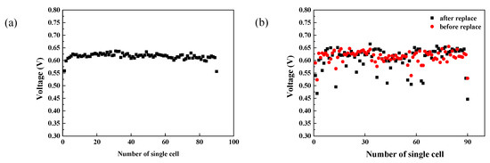 The cell voltage of a normal PEMFC stack with high consistency (a) and the cell voltage of a PEMFC stack before and after replacing specific cells (b).