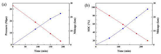 The mileage of the PEMFC forklift (a) and lithium ion battery forklift (b).