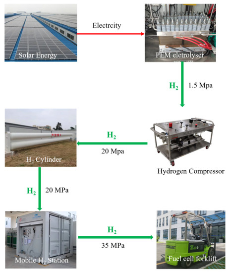 Figure 8 schematically presents the self-constructed hydrogen station which combines hydrogen production, storage and refueling inside the factory. The solar-driven hydrogen production was built by connecting solar panels and a PEM electrolyzer. The as-produced high purity hydrogen (99.99%) was then compressed and pressurized into the hydrogen tank (maximum capacity at 20 MPa: 700 Nm3) from 1.3 MPa to 20 MPa by a gas-driven hydrogen compressor. The inlet of the hydrogen storage tank was equipped with a stop valve, which was used to block the hydrogen of the compressor from entering the hydrogen storage tank in the case of a leakage. At the same time, a pressure relief valve was installed in the hydrogen storage tank, which was used to discharge overcharged hydrogen when the hydrogen pressure exceeded the set pressure. The hydrogen in the storage tank was further pressurized to 45 MPa by an electric compressor in the mobile hydrogen refueling station. Additionally, during refueling, high pressure hydrogen was filled into the 35 MPa carbon fiber-wound aluminum alloy tank of the PEMFC-powered forklift.