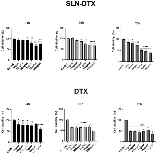 The cytotoxicity was determined by a colorimetric-based MTT assay. Cells were seeded in a 96-well plate at a density of 3 × 103 cells/well and incubated overnight. Then, each well was replaced with fresh medium containing 1 ng/mL, 10 ng/mL, 100 ng/mL, 1 µg/mL, 10 µg/mL, and 100 µg/mL of DTX, SLN-DTX, or culture medium (negative control) for 24, 48, or 72h. After the different incubation periods, the old medium was removed and MTT solution was added to each well, followed by incubation for 4 h at 37 °C to obtain formazan crystals. Finally, the cells and crystals were dissolved by adding dimethyl sulfoxide (DMSO) to each well followed by measuring the UV absorbance in the SpectraMax M5 (Molecular Devices, Sunnyvale, CA, USA) of these solutions at 595 nm to calculate the percentage of cell viability.