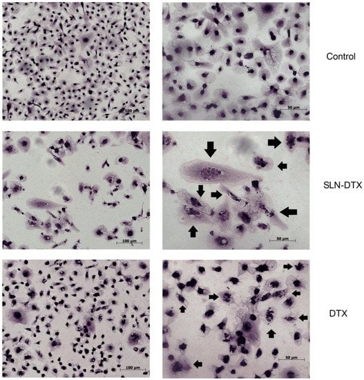 Morphological evaluation of the MDA-MB-231 cell line stained with hematoxylin and eosin after 72 h of treatment with SLN-DTX and DTX observed by light microscopy. Arrows indicate cells that show the altered nucleus, with multinucleation in both treatments.