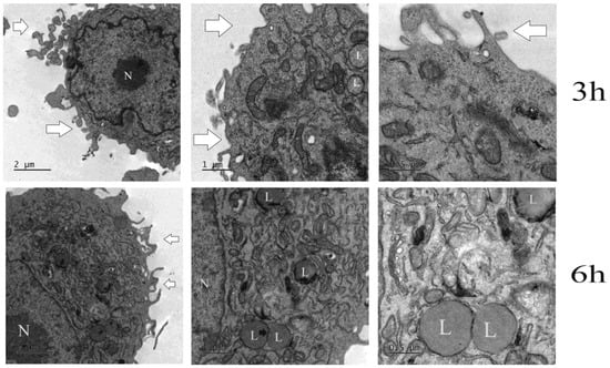 Transmission electron microscopy of MDA-MB-231 after 3 h and 6 h treatment with SLN-DTX. N indicates the nucleus, L the lysosomes, black arrows in the first image show the electrodense area on the lysosome where the presence of NLS-DTX can be observed, and the white arrows demonstrate the extensions of the cell membranes, which were still in the early stages of treatment.