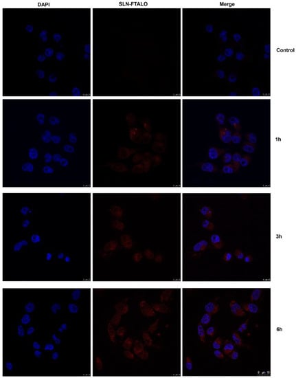 The location and time of internalization were also corroborated by the confocal microscopy with SLN-FTALO, as seen in Figure 8.