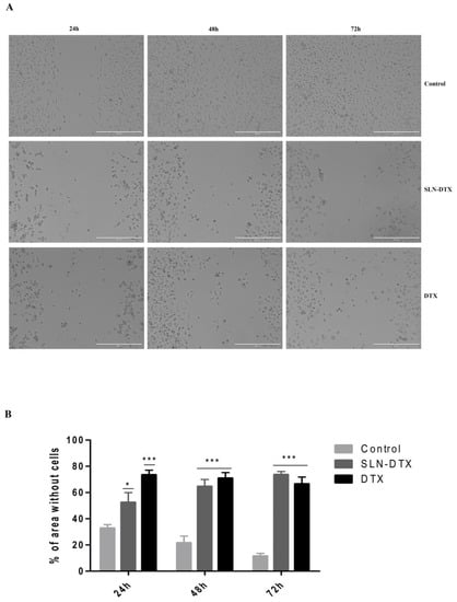 Through the wound healing assay, it can be seen in Figure 9 that the treatments with SLN-DTX and DTX inhibited cell proliferation and mobility when compared to untreated cells. At the end of 72 h, the control group had already filled almost the entire area, while in both treatments the cells did not have the same feature even after 72 h. Additionally, when the empty area is quantified, it is clear that the treatments changed the ability of cells to move.