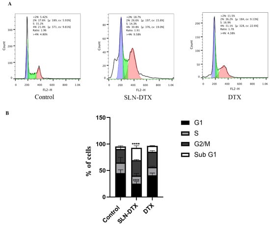 Cell cycle analysis of MDA-MB-231 after treatments. (A) Histograms of cell cycle phases, untreated cells, and cells treated with SLN-DTX and with DTX. Purple are cells in 2N, green are cells in S and pink are cells in 4N. (B) Quantification of the percentage of cells in each phase of the cell cycle. The results presented are from three independent experiments, with the mean percentage of cells in each cell cycle phase ± SEM. **** p < 0.0001 when compared to the control.
