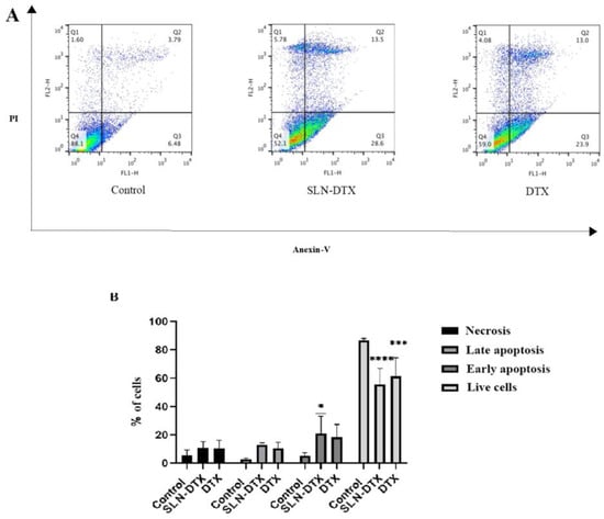 In the group of cells treated with SLN-DTX, there was an increase in cells trapped in sub-G1 compared to the control, a characteristic seen for other nanoparticles such as nanoparticles with folate-targeted nanoparticle docetaxel [], liposome-based co-delivery of siRNA and docetaxel [], docetaxel-loaded mixed micelles, and polymersomes DTX [], which could be linked to apoptosis of these cells.