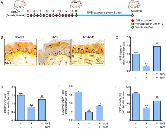 The expression of NNT in the epidermises of the animals in the UV group was significantly lower than that in the control group, whereas the expression of NNT in the UV/NVP group was significantly higher than that in the UV group (Figure 1B,C).