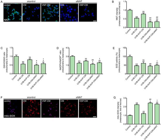 Regulation of the expression of NNT, the GSH/GSSG ratio, the NADPH/NADP+ ratio, SOD activity, and MitoSOX caused by NVP-mix treatment in melanocytes. (A) NNT expression in CM-treated melanocytes was determined by immunocytochemistry (scale bar = 50 µm) (green: NNT; blue: DAPI for nuclear staining). CM was obtained from UV-irradiated keratinocyte cultures treated with PBS or NVP-mix. (B) The intensity of NNT in the cells (image A) was quantified using Zen 2009 software. (C–E) The GSH/GSSG ratio in the mitochondria (C), NADPH/NADP+ ratio in the mitochondria (D), and SOD activity in the mitochondria (E) were measured with assay kits after isolation of the mitochondria from CM-treated melanocytes. (F) Mitochondrial peroxide levels were quantified with the fluorescent dye MitoSOX Red by immunofluorescence staining (scale bar = 50 µm) (red: mito-SOX; blue: DAPI for nuclear staining). (G) The intensity of mito-SOX (image F) was quantified using Zen 2009 software. Data are presented as the mean ± standard deviation; ** p < 0.01 second bar vs. first bar; $ p < 0.05, $$ p < 0.01 vs. second bar; # p < 0.05, ## p < 0.01 vs. third bar, † p < 0.05 vs. fourth bar (Mann–Whitney U test). CM, conditioned medium; DAPI, 4′,6-diamidino-2-phenylindole; GSH, glutathione; GSSG, oxidized glutathione; NADP+, nicotinamide adenine dinucleotide phosphate; NNT, nicotinamide nucleotide transhydrogenase; NVP, niacinamide + vitamin C + polydeoxyribonucleotide; SOD, superoxide dismutase; UV, ultraviolet.