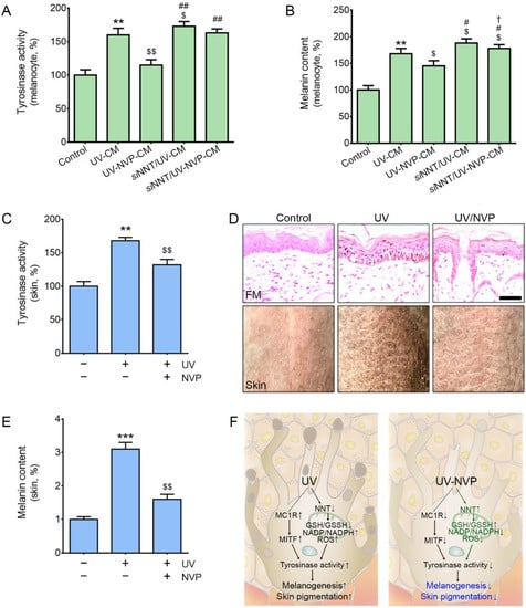 To determine whether melanocytes were affected by NVP-mix-treated keratinocytes, HEKn cells were irradiated with UV-B (200 mJ/cm2) for 5 min, treated with phosphate-buffered saline (PBS) or NVP-mix (1 mM), and cultured for 24 h. Then, the cell culture supernatants were collected (denoted as CMs) and treated with HEMn cells in the UV-CM and UV-NVP-CM groups, respectively. The NNT shRNA (cat. sc-150013-SH, Santa Cruz Biotechnology, Dallas, TX, USA; 1 µg) was transfected to HEMn cells using lipofectamine 3000 regent (Invitrogen, Waltham, MA, USA) for 12 h. After transfection, the cells were treated with the corresponding CM (siNNT/UV-CM and siNNT/UV-NVP-CM groups, respectively).