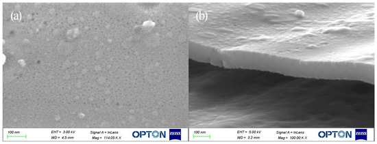 SEM surface and cross-sectional images of TiO2 film oxidized with a voltage of 80 V for 40 s. (a) Surface, (b) Cross section.