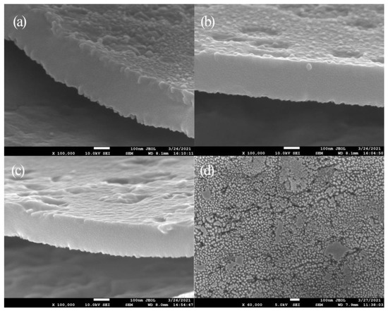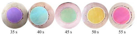 Next, a series of TiO2 films oxidized for 35 s, 40 s, 45 s, 50 s, or 55 s were prepared using an oxidation voltage of 80 V. Digital images of these films (Figure 3) indicate that each film exhibited a single structural color, with colors ranging from purple to red with increasing film oxidation time. Calculated interference wavelengths of reflected light for these films based on SEM results using Formula (1) are shown in Table 1. It can be seen that increasing the interference wavelength of reflected light derived from a natural light source is associated with increasing oxidation time and film thickness, with predicted structural colors found to be consistent with those observed experimentally.