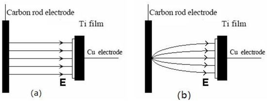 A type-1 result indicates the existence of a uniform electric field between the anode and the cathode during electrochemical oxidation that supports the same oxidation current density across all film surface regions, with current line distributions for this process shown in Figure 6a. By contrast, a type-2 result indicates that a non-uniform electric field exists between the anode and the cathode during the electrochemical process, such that the oxidation current density gradually decreases from the center of the film but is mainly the same throughout every single annulus. Based on the experimental results, it could reasonably be assumed that lines of electrochemical reaction current at higher oxidation voltages are radiating points, as shown in Figure 6b. Since the thickness of the film gradually became thinner as the current density of the point-like electrode gradually decreased along the radial line emanating outward from the film center, an annular and iridescent structural color was observed due to equal-thickness interference that occurred under natural light, as previously reported [27]. In addition, a region of color transition was observed between adjacent annulus colors due to the superposition of reflected light interference wavelengths in adjacent micro-areas with continuously changing micro-thicknesses.