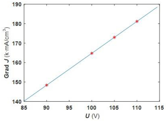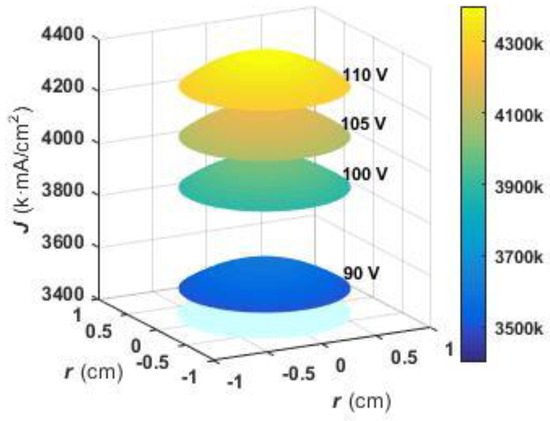 where k is a constant related to the electrolyte and temperature (in units of Ω−1), r is the distance from the film center to a certain point on the surface (r < 0.7 cm), h is the distance from the negative carbon to the anode (about 6 cm), and U is the oxidation voltage. Numerical simulations of the current density J of the anodizing film shown in Figure 4 were carried out, and current density distributions for different oxidation voltages are shown in Figure 8. It can be seen from the figures that the current density of the anodizing film also increases with increasing oxidation voltage, such that for a given oxidation voltage, the current density at the center of the film center is greatest and decreases symmetrically outward in all directions from the center. Thus, the track with the same current density is circular and thus appears as a single annular structural color.