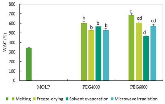The water absorption capacity of MOLP and solid-dispersed MOLP prepared by melting, freeze-drying, solvent evaporation, and microwave methods using PEG4000 and PEG600 carriers. Bars with different superscripts in the same category (PEG) were significantly different (p < 0.05).