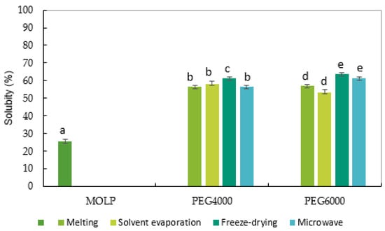 The solubility of the MOLP and solid-dispersed MOLPs prepared through melting, solvent evaporation, freeze-drying, and microwave irradiation using the PEG4000 and PEG6000 carriers. Bars with different superscripts in the same category (PEG) were significantly different (p < 0.05).