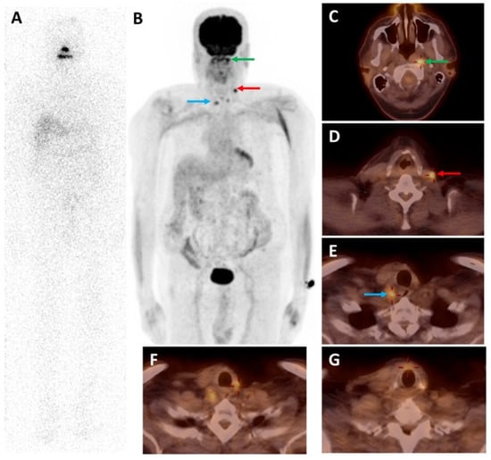 Figure 2. A 70-year-old man with PTC and nodal metastasis was treated with surgery and 131I therapy (cumulative dose of 600 mCi). (A) The last post-therapeutic 131I WBS was negative despite elevated serum Tg. [18F]FDG MIP skull-to-mid-thigh PET (B) and axial fused PET/CT (CG) images showed [18F]FDG-avid lesions in left retropharyngeal ((C), green arrow), left cervical ((D), red arrow), and right cervical ((E), blue arrow) lymph nodes, and thyroidectomy bed (F,G). All are suggestive of RAI-refractory disease.