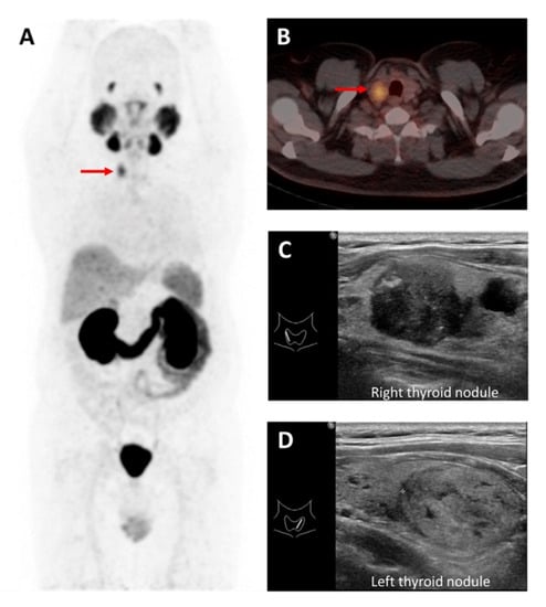 Figure 4. A 59-year-old man with prostate cancer post-radical prostatectomy. [68Ga]Ga-PSMA-11 MIP skull-to-mid-thigh PET (A) and axial fused PET/CT (B) images revealed a PSMA-avid right thyroid nodule (red arrow) despite bilateral thyroid nodules. The ultrasound images (C,D) revealed right and left thyroid nodules, respectively. He subsequently underwent thyroid surgery with confirmed PTC in the right thyroid nodule and benign left thyroid nodule.