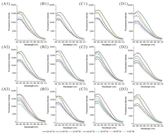 Fluorescence intensity and wavelength shift could provide information about tryptophan, tyrosine, and phenylalanine residues; the tryptophan residue was found to be dominant in absorbing the longest wavelength, displaying the largest extinction coefficient and being highly sensitive to the local environment []. The docking results obtained that the tryptophan residue in the binding site of α-La could be quenched by proton transfer from nearby anthocyanin []. In this experiment, the fluorescence spectra of α-La and P3G solutions subjected to different thermal treatments were recorded to examine the binding reaction. As shown in Figure 1, the fluorescence intensity of α-La was reduced with the increasing anthocyanin concentration due to the fluorescence quenching effect. Additionally, the maximum intensity wavelength at different thermal treatments changed little, indicating that the protein structures were not significantly affected by thermal treatments in the experimental conditions, and a similar result was found for HPP [].