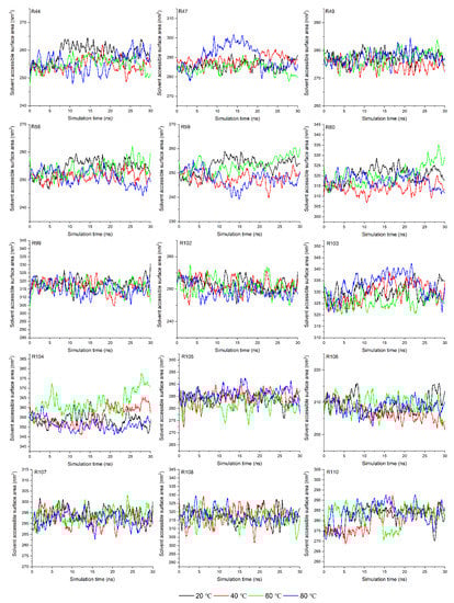 The solvent access area of α-lactalbumin residues in the binding site under different thermal treatments (letter R refers to the residues of α-Lactalbumin).