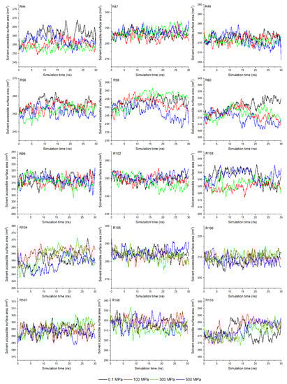 The solvent access area of α-lactalbumin residues in the binding site under different high pressure processing conditions (letter R refers to the residues of α-Lactalbumin).