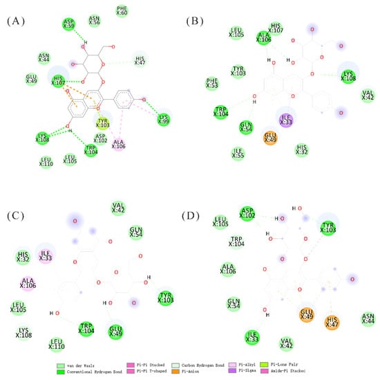 Molecular docking results of α-Lactalbumin and pelargonium-3-glucoside at different thermal treatments. (A–D): The interactions between residues of α-Lactalbumin and pelargonium-3-glucoside at 20 °C, 40 °C, 60 °C, and 80 °C, respectively.