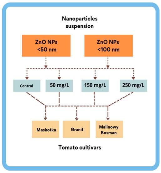 In this research, the influence of nano-ZnO on tomatoes was measured on three different tomato cultivars with NPs suspensions at three different concentrations. Each of the chosen cultivars belong to cherry-tomato-type tomatoes. Moreover, two different-sized NPs of nano-ZnO (≤100 nm and ≤50 nm) were used in order to disclose if this parameter may additionally influence the parameters related with seed germination (Figure 1).