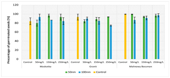 During the experiment, approximately 10 to 15 seeds germinated on each plate. For the cultivar Granit treated with 250 mg/L ZnO NPs (<100 nm), the mean result of germination was 10 seeds per plate, and for the cultivar Malinowy Bossman, it was 15 germinated seeds at a concentration of 50 mg/L (<50 nm) per plate. The highest GP was received for the Malinowy Bosman cultivar treated with <50-nm-size NPs (GP equal over 90% for all used concentrations), whereas the Granit cultivar presented the lowest growth while being treated with <100 nm size NPs (74.6% GP at a concentration of 250 mg/L).