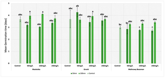 The other mentioned feature that has affected the MGT results was the type of cultivar. The disparity between cultivars is considerable. For example, at a concentration of 250 mg/L (NPs < 50 nm), the lowest result was obtained by the cultivar Malinowy Bossman, while the MGT of the Maskotka and Granit cultivar at the same conditions were 26% and 33% higher, respectively. The trend is similar for other concentrations, even for the suspension of <100 nm NPs. At a concentration of 150 mg/L (NPs < 100 nm), the lowest MGT was obtained again by Malinowy Bossman, and the results of the Maskotka and Granit cultivars were 24% and 18% higher, respectively. Nevertheless, the tendency has demonstrated that lower results were obtained with the treatment of <50 nm NPs. The Maskotka cultivar was the one in which the treatment of NPs (<50 nm) significantly reduced the mean germination time of the seeds. In comparison to the control, the MGT of Maskotka was reduced by 13.5% at a concentration of 50 mg/L, 19% at a concentration of 150 mg/L, and 8% at a concentration of 250 mg/L. Interestingly, the concentration of the used NPs suspensions did not have an essential impact on the results of the MGT, except for the Granit cultivar which reached the highest value of MGT of all the cultivars at a concentration of 50 mg/L.