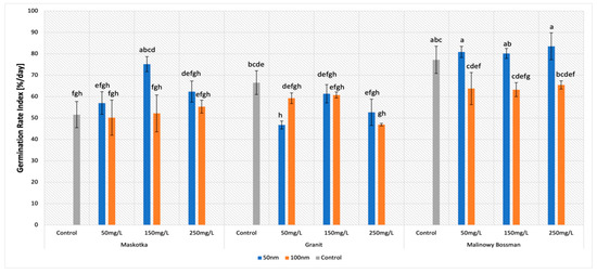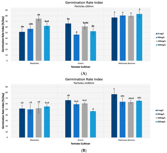 The highest results of the GRI were mostly achieved with the use of the suspensions of <50 nm NPs. For the cultivars Maskotka and Malinowy Bossman, results obtained from treatment with the use of <50 nm NPs was significantly higher than with the usage of <100 nm ZnO NPs (Figure 5A) and noticeably higher than the controls. For the Maskotka cultivar, the suspension of NPs (<50 nm NPs) at a concentration of 150 mg/L was optimal, and the obtained value of the GRI was 45.7% higher than the control and 44% higher than the suspension at the same concentration, but with <100 nm NPs. Interestingly, the treatment of <100 nm NPs, in most cases, led to a lower GRI value compared with the control (Figure 5B), which suggests that the <100 nm NPs have a negative impact on tomato seeds. In general, for the Maskotka cultivar the usage of <50 nm NPs resulted in an increase in the GRI. In contrast, for the same cultivar, the treatment with <100 nm had an adverse effect. For the Malinowy Bossman cultivar, the situation is similar. However, the result of <50 nm NPs treatment is not notably higher than the GRI of the control. For the Granit cultivar, each treatment had an adverse effect on the seeds, regardless of the concentration of the used suspension or the size of the NPs. The results after treatment were considerably lower than from the control. Surprisingly, the GRI value obtained after the treatment of the <50 nm NPs suspension, even at the concentration of 50 mg/L, were lower by 30% from the control. This is the only case in which the <50 nm NPs suspension caused a decrease in the GRI.