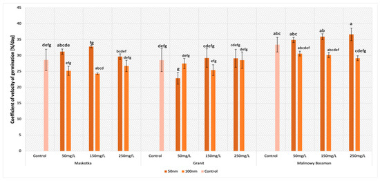 The parameter of the coefficient of velocity of germination (CVG) in general gives an indication of the rapidity of germination. The received data indicate that the concentration of the used ZnO NPs suspensions had no significant influence on the CVG in this study (Figure 6). Nevertheless, factors such as the type of cultivar or the size of the NPs affect this parameter significantly. The highest values of the CVG were achieved by the Maskotka cultivar when the seeds were treated by <50 nm ZnO NPs. Seeds incubated with the NPs suspensions (<50 nm) at the concentration of 150 mg/L reached a 14.7% higher result than the control. Additionally, the ZnO NPs suspension at concentrations of 50 mg/L and 250 mg/L led to obtaining higher results than the control by 9.1% and 3.5%, respectively.