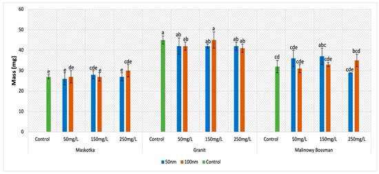The results obtained for the examination of dry weight indicates that mainly the cultivar type influences this parameter (Figure 7). Interestingly, the mass of the seeds which were under the treatment of the ZnO NPs suspensions, independently from the concentration of the suspension or the size of the NPs, is similar to the mass of the corresponding controls. Although for the Maskotka cultivar, differences between the mass of the samples and the control are inconsiderable, for the other two cultivars, the situation is slightly different. For instance, for the Granit cultivar, all results are lower than the control (except for ZnO NPs < 100 nm at a conc. of 150 mg/L) by approximately 7%. In contrast, the suspension of <50 nm NPs at concentrations of 50 and 150 mg/L provided higher results by 12.5% and 15.6%. Interestingly, for this cultivar, the results provided by the treatment of <100 nm NPs are higher than the control as well, except for the seeds treated with ZnO NPs at a concentration of 50 mg/L. The obtained results are higher than the control by 3% for the 150 mg/L concentration of the used suspension and by 9.4% by the 250 mg/L suspension.
