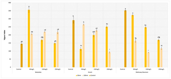 Another parameter that was examined in our research is the GRI. In general, the best results for this parameter were achieved with the use of <50 nm ZnO NPs. For cultivars Maskotka and Malinowy Bossman, values of the GRI obtained for the treatment of the <50 nm ZnO NPs was much higher than for the <100 nm ZnO NPs and noticeably higher than for the controls. Interestingly, the treatment of the <100 nm ZnO NPs in most cases led to a lower GRI value compared to the control. That observation may lead to a conclusion that larger-sized ZnO NPs may be assumed as toxic for tomato seeds. As the germination rate index is the parameter that relates to the percentage of the germination of seeds during each day, this conclusion coincides with the results of the MGT. However, in the case of the GRI, the statistical analysis helps to notice that all applied features influence the results. As it was mentioned above, the usage of <50 nm ZnO NPs caused higher results for the Maskotka and Malinowy Bossman cultivars. At the same time, the use of <100 nm ZnO NPs ensued in obtaining lower GRI values. Interestingly, the seeds of the cultivar Granit reacted adversely for the beforementioned treatment. For this cultivar, <50 nm ZnO NPs as well as <100 nm ZnO NPs caused a decrease in the GRI values. The third factor which affected the results was the used concentrations of the NPs suspension. For the Maskotka cultivar, the concentration of <50 nm ZnO NPs had a significant value. The highest result was obtained with the use of the 150 mg/L suspension, then for the 250 mg/L concentration, and surprisingly, the worst for the 50 mg/L. For the same cultivar, when the <100 nm ZnO NPs were used, the concentration of the suspension did not affect the results significantly. Inversely, in the case of the Malinowy Bossman cultivar, regardless of the used concentration, the tendency was constant. The usage of the <50 nm ZnO NPs gave slightly higher results than the control, but was similar for all used concentrations. The usage of the <100 nm ZnO NPs caused a substantial diminution of the GRI, but the results for all concentrations, except the control, were comparable. For the Granit cultivar, even though the GRI was lower than for the control, the usage of different concentrations of <50 nm brought different results. While for the <100 nm ZnO NPs, the suspension at 50 mg/L and 150 mg/L concentrations provided the same results, and only the 250 mg/L suspension caused a greater decline of the GRI value. The comparison of the results of the GRI parameter clearly indicates that studies on the influence of different types and sizes of NPs on plants must be more extended. In the research of Siddiqui and Al-Whaibi [25], the influence of different concentrations of SiO2-NPs on tomato seeds was measured. In this study, authors proved that different concentrations of an NPs suspension affect the germination parameters of tomato seeds. The treatment of 8 g/L nSiO2 provided the best results and increased parameters such as nSiO2-increased seed germination by 22.16%, germination mean time by 3.98%, the Seedling Vigor Index by 507.82%, and the Seed Germination Index by 22.15%, compared to the controls. Nevertheless, in this study, only one type of cultivar was examined, which causes a problem in comparing the results from that research with our findings. However, it still proves that the concentration of the used suspension may influence the results of sprouting.