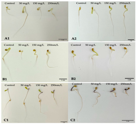 The picture of seedlings after 5 days of incubation. The seedlings of Maskotka cultivar treated with the suspensions of NPs (A1) <50 nm and (A2) <100 nm. The seedlings of Granit cultivar treated with the suspensions of NPs (B1) <50 nm and (B2) <100 nm. The seedlings of Malinowy Bossman cultivar treated with the suspensions of NPs (C1) <50 nm and (C2) <100 nm.