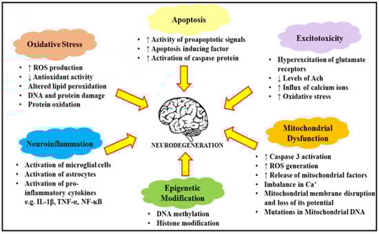 Description of factors leading to neurodegeneration processes. The further progression of these processes leads to the exacerbation of apoptotic factors, the increase in oxidative stress and excitotoxicity, neuroinflammation and mitochondrial dysfunction. ROS: reactive oxygen species; DNA: deoxy ribonucleic acid; Ach: Acetylcholine; IL-1β: interleukin 1 β; TNF-α: Tumor necrosis factor-α; NF-κB: Nuclear factor kappa B.