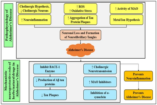The herbal drugs that are used in the management of Alzheimer’s disease function by activating the neurotransmission of cholinergic neurons, promoting the inhibition of BACE1, α-synuclein and monoamine oxidase (MAO) proteins and preventing neuroinflammation are described in Figure 2 and Table 1.