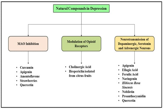 Depression is a serious medical neurological condition and is highly prevalent in both the developing and developed nations, with an estimated lifetime prevalence of over 15–20%. The most acceptable theory of researchers that facilitates the understanding of depression is the monoamine theory, according to which a decrease in monoamine neurotransmitters, namely dopamine, norepinephrine and serotonin, is found in the brain of the depressed patients. The antidepressant therapy mainly focuses on the reversal of monoamine neurotransmitter deficiency in the brain. Several new antidepressants such as venlafaxine and many more which promote the reuptake of neurotransmitters and prevent their degradation thereby improving the symptoms of depression have been introduced into the market [,]. However, long term consumption of these antidepressant drugs or their chronic use can induce serious adverse reactions upon their interaction with food and other concomitant drugs. Besides the availability of vast antidepressant drugs, there still exists over 10–30% of the population globally who still continue to experience episodes of depression, thereby suggesting the need to discover and develop newer agents with antidepressant properties and enhanced efficacy with minimal associated adverse effects []. Several ongoing studies have established natural polyphenol compounds isolated from a wide array of natural products which possess antidepressant properties and are being utilized as adjuvants in the management of conditions like major depression. The natural polyphenol molecules obtained from herbal drugs are non-essential micronutrients and possess several physiological and biochemical properties. They have been discovered to play a significant role in the management of different neurological and psychological disorders []. The polyphenol molecules exert a neuroprotective effect and significantly modulate the neurotransmission of monoaminergic neurons in the brain and have an anti-depressant-like activity. Some of the major polyphenol molecules with anti-depressant effects are described below.