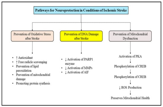 The natural medicines aid in the management of ischemic stroke by decreasing oxidative stress and preventing the damage to DNA and mitochondrial dysfunction by several mechanistic pathways. Oxidative stress due to excessive production of reactive oxygen species (ROS) is the utmost factor responsible for inducing cerebral ischemia and its further progression, which causes injury to brain. It also stimulates the peroxidation of proteins, lipids and nucleic acids which contributes to further dysfunction in mitochondria and produces damage to DNA and ultimately leads to neuronal cell death. After an episode of ischemic stroke, a transient or permanent decrease in the flow of blood is noted; this causes injury to the brain tissue and can even lead to its death []. The restoration of blood flow has been proposed to be helpful for the management of ischemic stroke, however, through studies it has also been determined that reperfusion of blood flow induces injury to the brain due to the presence of a large number of ROS which are synthesized during this process, and damage the cellular components including carbohydrates, nucleic acids, proteins and lipids. The ROS interfere with the synthesis of proteins and cause damage to the DNA, mitochondrial structure and endothelial cells, which further reduces the production of energy and causes microcirculation disorders. The impairment of DNA further worsens the neurodegeneration, and its repair is critical to restore normal function and is the primary cause of several neurovascular disorders. Decreasing the activation of poly ADP-ribose polymerase-1 (PARP-1), matrix metalloproteinases and apoptosis inducing factor (AIF) can significantly prevent DNA damage. ROS synthesis and the lipid reoxidation process in the body comprise a dynamic equilibrium disruption which induces a series of metabolic diseases and impairs the functioning of bio membranes of cellular proteins and hence plays a crucial role in the cellular damage produced after an episode of ischemic stroke []. The promotion of antioxidant system of body, i.e., activation of superoxide dismutase, catalase and glutathione and further scavenging of ROS is one of the best approaches which can be implemented in the management of oxidative stress mediated brain damage. Mitochondria are the powerhouse of the cell and damage to them is a crucial event that occurs after an episode of ischemic stroke. The excessive amount of ROS generated by mitochondria terminates the electron transport chain and reduces the production of ATP, consequently damaging the functioning of this cellular organelle. The dysfunction of mitochondrial DNA can be prevented by the activation of protein kinase A, which further causes the phosphorylation of CREB and decreases the production of ROS []. To conclude, mitochondrial dysfunction has been evaluated to be a prominent factor involved in the pathology of several neurodegenerative disorders, thereby indicating it to be a promising target for the development of therapeutic treatments for management of neurodegenerative disorders. The compiled descriptions of pathways which can be targeted for the management of ischemic stroke are described in Figure 5.
