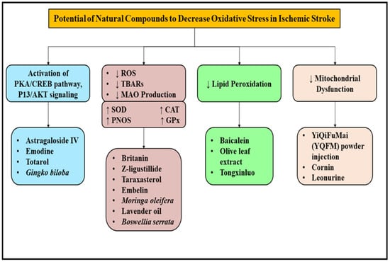 Totarol, isolated from Podocarpus totora, has been studied to reduce the volume of infarct in in-vivo and in-vitro studies and was concluded to attenuate the effects of ischemia-reperfusion injury. It mainly acts by increasing the antioxidant levels of glutathione and superoxide dismutase and elevating the levels of heme oxygenase 1 and other associated proteins by activating the PKA/Creb pathway, thereby suppressing the levels of ROS and producing neuroprotective effects []. Taraxasterol, a pentacyclic triterpene namely extracted from Taraxacum officinale, also reduced the production of ROS in the hippocampal region of the brain, which further ameliorated oxidative stress by regulating the Nrf2 signaling pathway and prevented ischemic injury []. Britanin, an activator of Nrf2 protein, also displayed neuroprotective effects and presented excellent protection towards the cerebrum in an animal model induced with middle cerebral artery occlusion and reperfusion. The antioxidant activity of britanin was mainly due to its selective binding with the 151 conserved cysteine residue of Keap1 and prohibited the ubiquitylation of Nrf2 and hence prevented ischemic injury []. A major bioactive compound isolated from the dried roots of Astragalus, species namely Astragaloside IV, was found to improve cognition and memory impairment resulting from ischemic stroke. The molecule successfully protected the neurons from further injury and death upon an acute episode of ischemic stroke by maintaining the functioning of mitochondria via modulating the PKA/CREB pathway []. Several natural medicines with antioxidant activity and the potential to improve mitochondrial dysfunction are being extensively researched and used in the management of countless neurodegenerative disorders. Leonurine and cornin, other antioxidant natural bioactive compounds, have been indicated to decrease the volume of infarct and improve neurological defects by modulating the functioning of mitochondria and prohibiting the production of ROS and further suppressing oxidative stress [,]. A bioactive molecule isolated from Tripterygium wilfordii, namely celastrol, protected the cerebral region of the brain from an acute episode of cerebral ischemia by suppressing oxidative stress via phosphorylation of the c-Jun-N-terminal kinase (p-JNK) and NF-κB which aided in the reduction of ROS in the brain []. Emodin, a bioactive compound extracted from Polygonum multiforum considerably decreased the volume of infarct by activating the signaling of phosphatidylinositol 3-kinase (PI3K)/protein kinase B (AKT), which considerably improved the functioning of motor functions of the brain and prevented damage induced by ischemic stroke []. Another bioactive benzoquinoe derivative, namely Z-ligustilide, which is isolated from Angelica sinensis, protected the disruption of blood brain barrier by alleviating neuroinflammation and oxidative stress after an acute episode of ischemic stroke []. Embelin, a naturally occurring bioactive molecule derived from dried berries of Embelicaribes, produced significant recovery of motor functions of the brain and presented protective effects by reducing the levels of lipid peroxidase and increasing glutathione content, thereby expressing antioxidant activity and significantly preventing the after effects of ischemic stroke []. Hence, a wide variety of natural medicines have been studied and explored in the management of ischemic stroke, as shown in Figure 6, which implicates natural medicines to be an emerging and promising treatment approach for the management of damage induced by ischemic stroke and reperfusion injury.