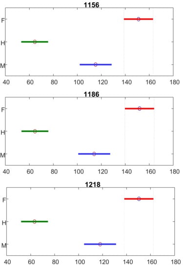 ANOVA of the intensity of 1156, 1186, and 1218 cm−1 bands demonstrate statistically significant differences in these vibrations that can be used as marker bands for differentiation between female (F), hermaphrodites (H), and male (M) cannabis plants. The ANOVA also reported a 95% confidence interval for the true value of median for each compared group. X axes represent ranks of 1156, 1186, and 1218 cm−1 band intensities (Dou, et. al., 2021).