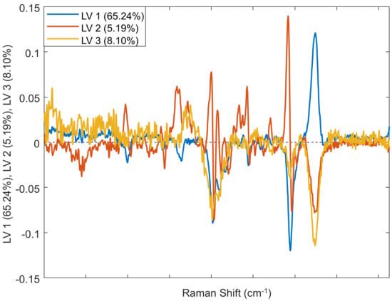 Loading plot of the three predictive components (PC) in the Raman spectra of male, female, and hermaphrodite cannabis plants. See Table 1 for a description of the biological origin of the bands.
