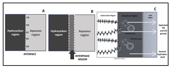 The Guggenheim model is particularly appropriate to adapt to a lipid membrane if the contribution of the head group region is taken into account (Figure 1C). In connection with this definition, the thermodynamics of a monolayer was described by Defay-Prigogine (and extended by Damoradam and Disalvo) as a bidimensional solution of polar head groups embedded in water [30,31,32]. This visualization of the interphase makes that monolayers’ and bilayers’ behavior can be compared considering the physical chemistry of this region as an aqueous polar solutions, something that in the current biological literature is absent [33].