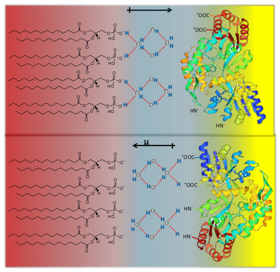 Different lipid packing states in biomembranes that form coexisting domains (i.e., relatively ordered and disordered domains such as lipids in the liquid condensed or the liquid expanded state) are assumed to have functional characteristics [40]. However, it must be considered that each packing state implies different water levels and arrangements giving place to regions in which water surface tension is different, i.e., the excess of surface free energy. Thus, they act as an energy reservoir that would explain the responsiveness of lipid membrane to bioeffectors present in the adjacent media (aminoacids, peptides, enzymes, etc.). The changes in surface tension, as stated in Equation (6), are modulated by the influence of lipids on water structure and this is manifested in conditions in which lipids form a coherent array (at c.a. 5–10 mN/m) ending at the collapse pressure (c.a. 45 mN/m) depending on the lipid [41]. Thus, a correlation between lipid packing and water activity is inherent to functional activity.