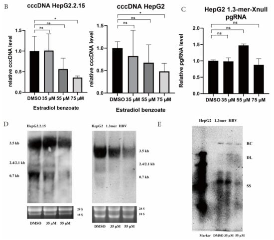 HBx plays a momentous role in the HBV life cycle, which is essential for virus replication and cccDNA transactivation. We detected the inhibitory function of estradiol benzoate and 17β-estradiol on HBV protein translation, HBV RNA transcription, and HBV DNA replication in the HepG2.2.215 system and 1.3mer HBV transfection system (Figure 2A). The ELISA results showed that those two drugs inhibited the secretion of exocellular HBeAg and HBsAg in a dose-dependent manner (Figure 2B,C), while supernatant HBV DNA did not show a significant decline (Figure 2D). In the 1.3mer HBV X-null plasmid transfected cells, supernatant HBsAg, HBeAg, and HBV DNA did not significantly differ between the groups (Figure 2). We further evaluated the inhibitory effect of estradiol benzoate and 17β-estradiol on HBV RNA transcription. After 72 h of treatment, the level of pgRNA (3.5 kb) was analyzed by RT-qPCR of the relative gene expression level to β-actin. Compared with the DMSO group, the levels of pgRNA of the drugs-treated group in HepG2.2.15 and transfected HepG2 cells were inhibited in a dose-dependent manner, and when the concentration reached 55 µM, the pgRNA demonstrated a significant reduction (Figure 3A). In the 1.3mer HBV X-null plasmid transfected cells, pgRNA did not significantly differ between groups (Figure 3C). To further verify this conclusion, a Northern blot was utilized to explore the effect of estradiol benzoate on HBV RNA in the HepG2.2.15 and 1.3mer HBV–transfected HepG2 cells. The Northern blot results showed that the HBV RNA synthesis was influenced by estradiol benzoate, as 3.5 kb RNA, 2.4/2.1 kb RNAs, and 0.7 kb RNA declined in a dose-dependent manner (Figure 3D). To evaluate the effect of estradiol benzoate on the cccDNA, HepG2.2.15 and transfected HepG2 cells treated with estradiol benzoate were examined by qPCR following a Hirt extraction. The results showed that the cccDNA demonstrated a dose-dependent reduction (Figure 3B). The Southern blot results also showed that estradiol benzoate inhibited various forms of HBV intracellular DNA replication intermediates in 1.3mer HBV plasmid–transfected HepG2 cells treated with estradiol benzoate for three days, compared with the DMSO group (Figure 3E). Taken together, these results demonstrated that estradiol benzoate had a downregulation effect on HBV translation, transcription, and replication.