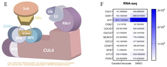 Estradiol Benzoate is the synthetic benzoate ester of estradiol (Figure 4A). HBx protein is a soluble protein with a large proportion of hydrophobic structures, which will form polymers with each other in solution or combine with other protein structures (Figure 4C). We assumed that estradiol benzoate represses HBV replication and translation through the inhibition of the HBx protein. The HBx structure has been modeled by I-TASSER (job id: S678536). Model 1 of the HBx (C-score = −4.40, estimated template-modeling (TM)-score = 0.25 ± 0.08, and estimated root mean square deviation (RMSD) = 15.4 ± 3.4Å) was adopted to predict the interaction of HBx and estradiol benzoate (Figure 4B). The protein was processed with the Autodock4.2 software. The docking for the HBx and estradiol benzoate was calculated using the Autogrid and Autodock programs, and the results were visualized using Pymol. The docking results showed that TRP87 and TRP107 of the HBx protein could form hydrogen–oxygen bonds with estradiol benzoate (Figure 4D). Interestingly, HBx binds with DDB1 at its larger pocket enclosed by its BPA-BPC double propeller fold, using a three-turn α-helix (termed H-box), which is essential for its reported stimulatory activities in cultured cells and might be required for efficient viral infection [7] (Figure 4E). This α-helical range from Ile88 to Leu100 closely overlapped the sequence from TRP87 to TRP107. Intermolecular docking between the HBx and estradiol benzoate may block the H-box from reaching out to bind with DDB-1. DDB-1 can bind to other adaptor proteins and perform its E3 protein function. The RNA-seq results revealed that CUL4-DDB1-related downstream genes were reduced after being treated with estradiol benzoate. The gene expression of EXO1, OSR1, AFP, CRB2, CDC45, ESCO2, MCM10, GPC3, CENPI, MYB, ATF3, and PER2 from the HepG2.2.15 cells all showed a decrease after being treated with 55 µM of estradiol benzoate for two days, indicating the activation of other DDB1-CUL4-related signals.