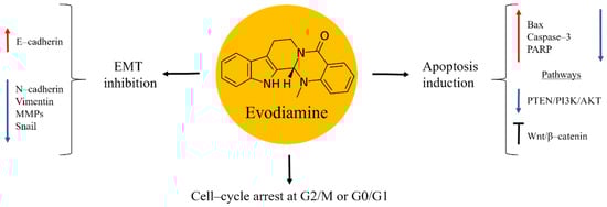 - Meng, Z.-J.; Wu, N.; Liu, Y.; Shu, K.-J.; Zou, X.; Zhang, R.-X.; Pi, C.-J.; He, B.-C.; Ke, Z.-Y.; Chen, L.; et al. Evodiamine inhibits the proliferation of human osteosarcoma cells by blocking PI3K/Akt signaling. Oncol. Rep. 2015, 34, 1388–1396. [Google Scholar] [CrossRef]